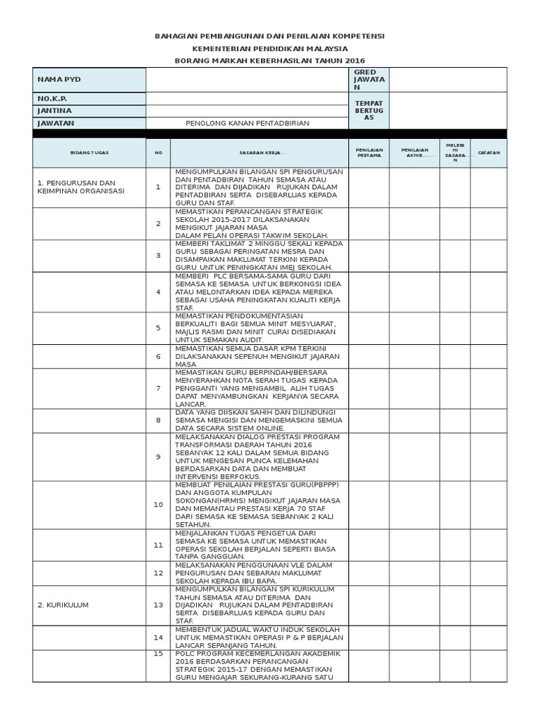 CONTOH KEBERHASILAN PK PENTADBIRAN. BAHAGIAN PEMBANGUNAN DAN PENILAIAN KOMPETENSI KEMENTERIAN PENDIDIKAN MALAYSIA BORANG MARKAH KEBERHASILAN. Muat turun Borang Keberhasilan 2021.