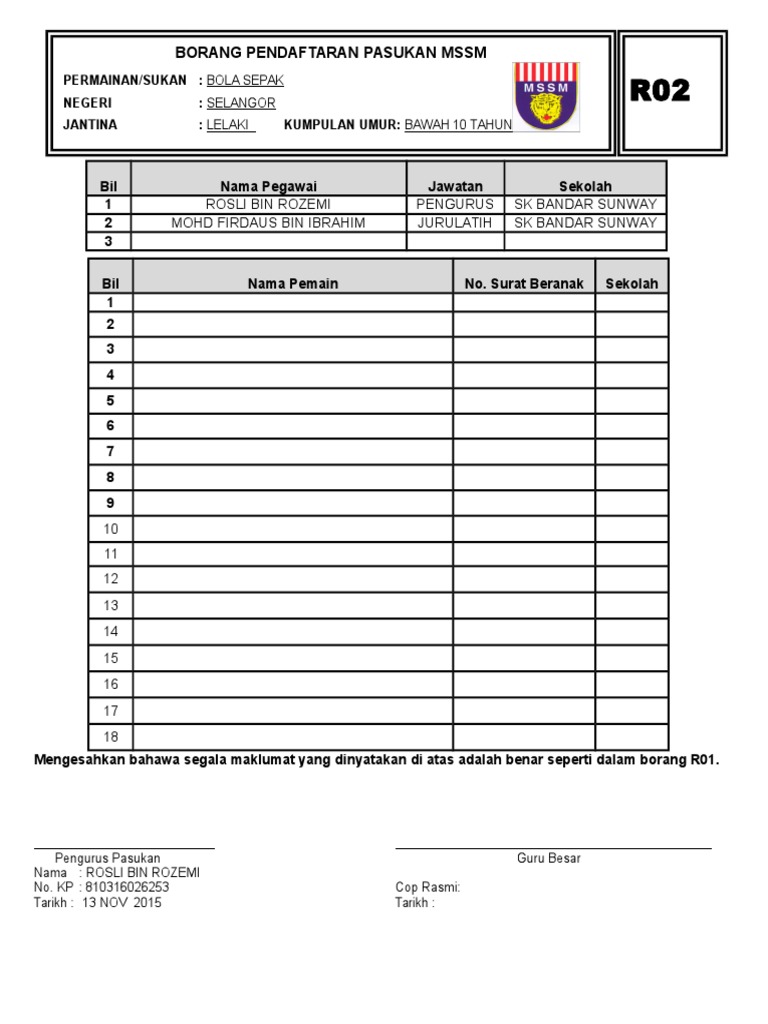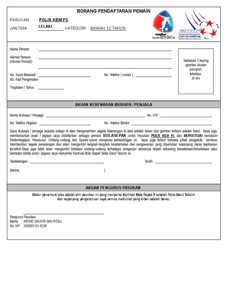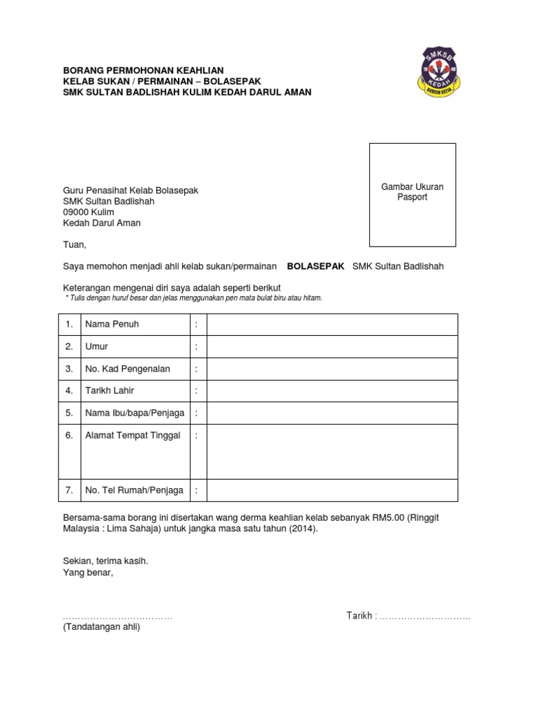 Borang permohonan bola sepak. Urusetia Pertandingan Bola Sepak Perpaduan 7 Sebelah UNITY CHALLENGE SHIELD 2015 adalah di alamat. Sekolah Sukan Malaysia Sabah. MS Word doc Acrobat pdf.