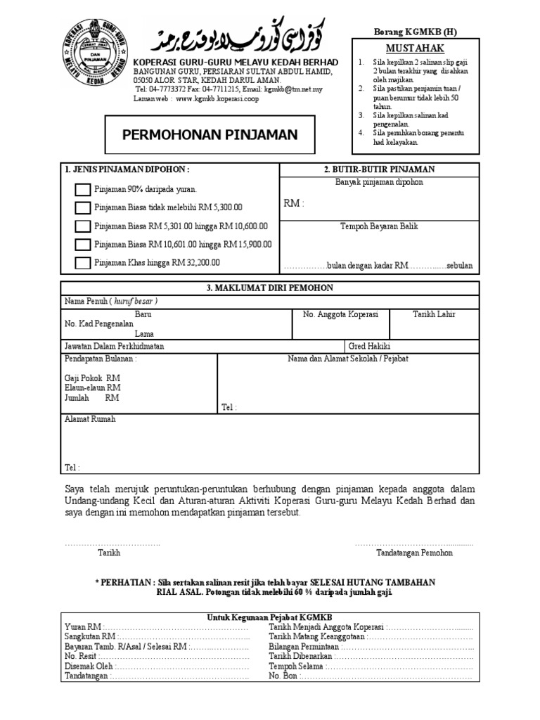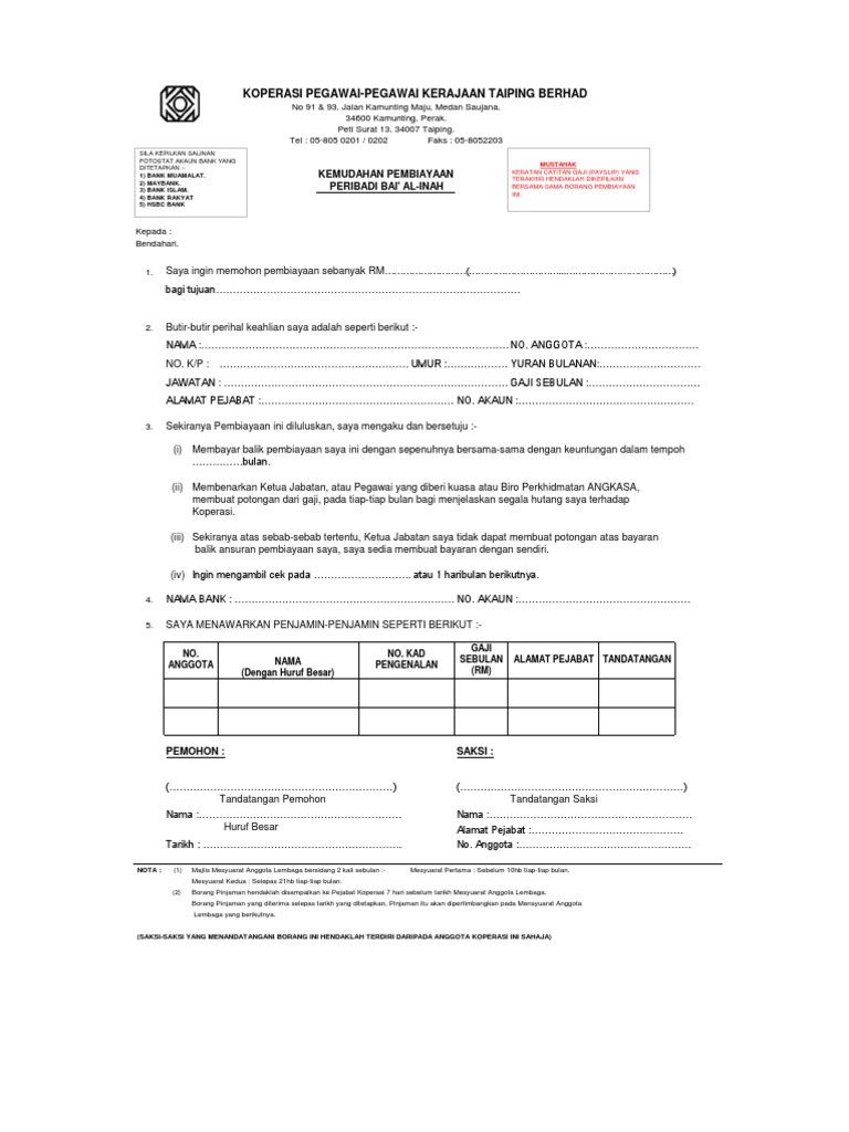 Borang pinjaman koperasi. Koperasi Polis Diraja Malaysia Berhad. 603 5519 5912 603 5510 4512 603 5512 0689. Koperasi Kakitangan UiTM Berhad.